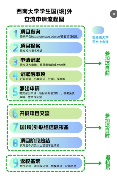 2. 根据如下图示完成项目申请、派出、返校等流程。(提交报名表后,请关注申请流转记录(平台-个人中心):