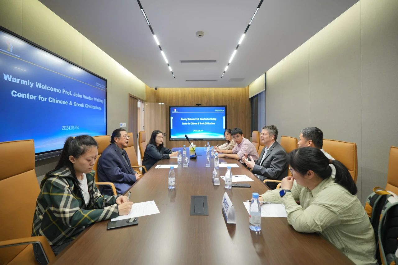 在会见中,崔延强教授对John Vontas教授的来访表示了热烈的欢迎,并简要介绍了中希文明互鉴中心的宗旨、特色及取得的成果。他强调,中心致力于推动中希两国间的文明交流与互鉴,通过深化学生培养和学术研究,不断拓宽合作领域,为两国教育、科研事业注入新的活力。崔延强教授还关切地询问了在希腊留学生的生活和学习情况,表达了中心对学子们的深深关怀。