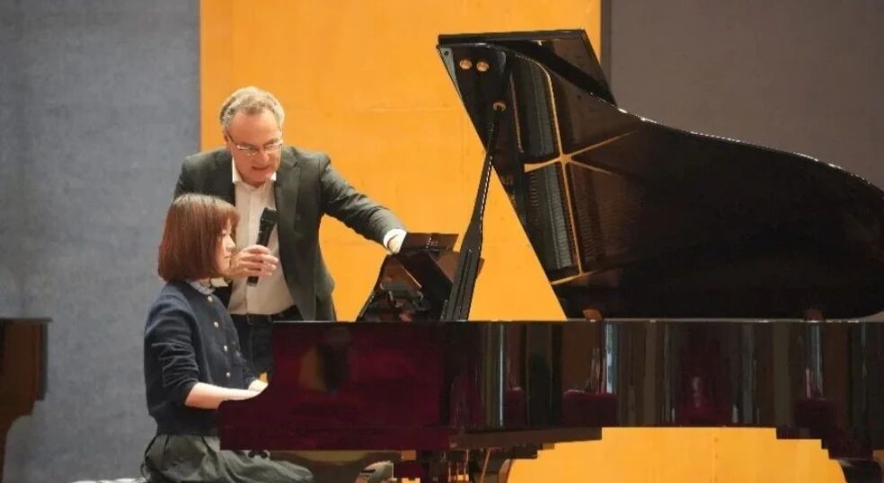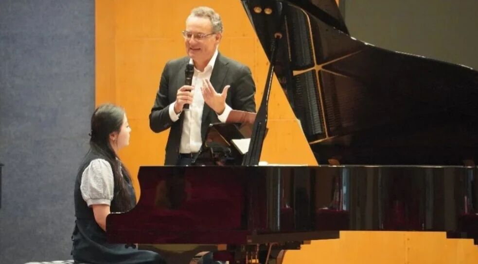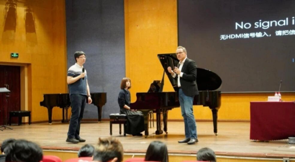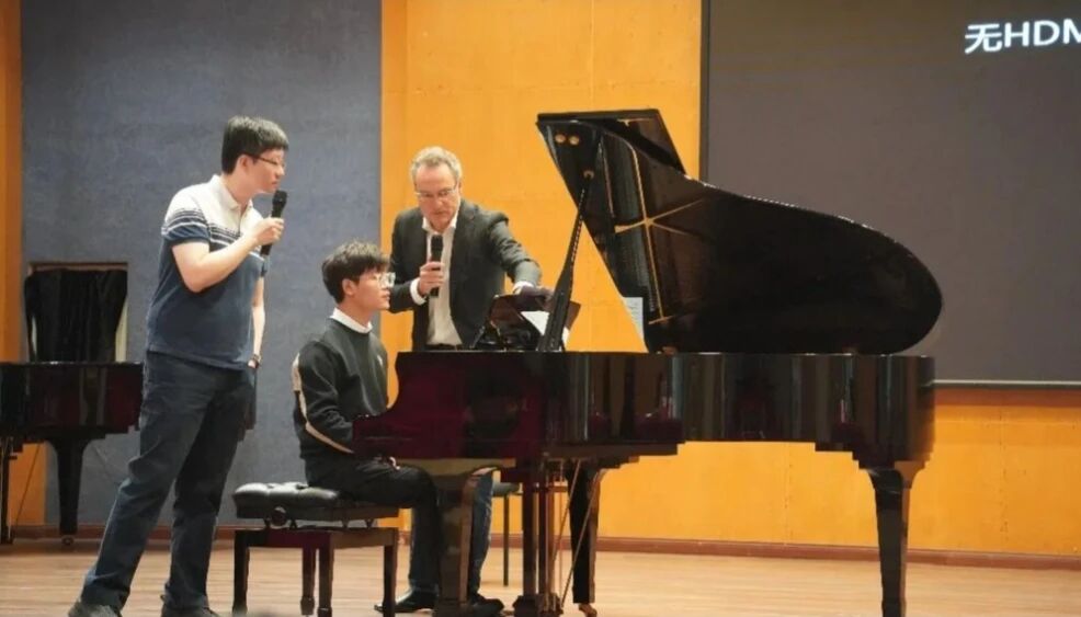 在随后的钢琴公开课环节,李锦程、邢宁淇和邓忻芮三位同学分别演奏了贝多芬与莫扎特的奏鸣曲。Laaris博士对每位同学的演奏都给予了肯定与点评,尤其是在踏板运用的艺术性、音乐风格的准确性以及音色处理的细腻度等方面提出了建议。他特别强调了音乐动机的统一性与节奏的稳定控制,建议同学们在演奏中既要清晰地呈现作品的动机发展,又要注重声部间的连贯与平衡。同时,他通过对比示范演奏,让同学们直观感受到不同触键方式带来的音色变化,并指出:"伟大的音乐存在于细节之中,每一个音符都应该被赋予生命。"