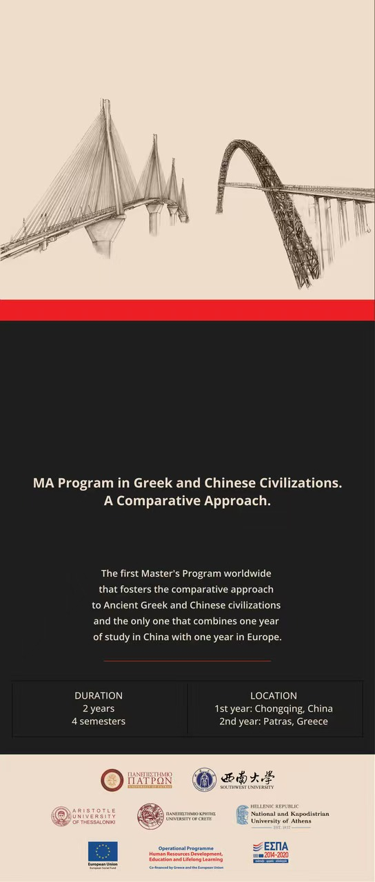 中国-希腊文明比较国际联合硕士项目(MA in Chinese and Greek Civilizations: a Comparative Approach)是中国和希腊之间的首个联合硕士项目,也是国际上首个致力于对中希两大文明进行比较研究的硕士项目,得到了中希两国教育部的指导和大力支持。本项目融合中希两国优质的教育资源和先进的人才培养理念,赋予学生深厚的专业素养和良好的跨文明对话能力,培养具有国际视野和全球胜任力的高层次创新型文科人才以及沟通中国和世界的文化使者。